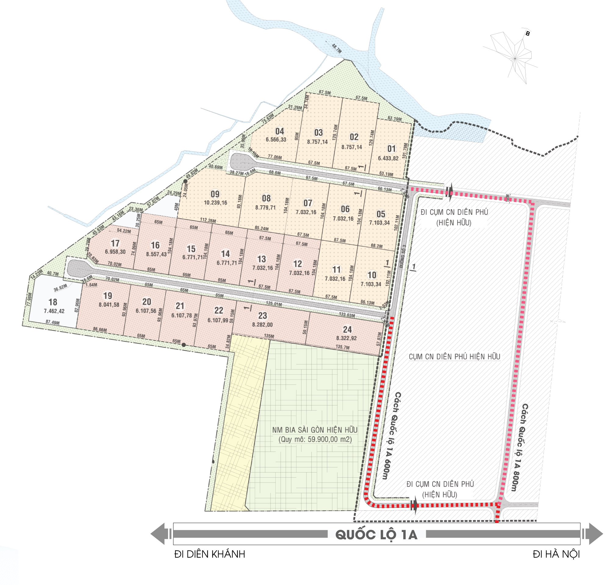Roads include an internal road with 2 lanes of 24-28m and a main road with four lanes of 35m to ensure that large displacement vehicles can enter. In the future, a new road will be built through the area.